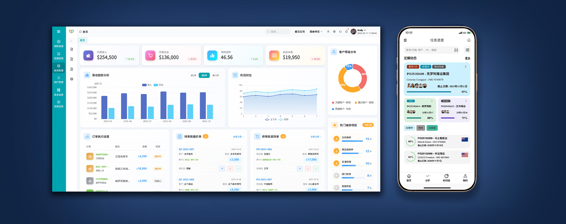 构建完善的客户 360° 视图,整合船名、供应商等多个维度信息,并支持中英文界面切换,以此提升客户服务质量和效率。